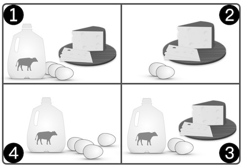 F:ありがとう。じゃ、れいぞうこからたまごを2個とチーズを出してください。